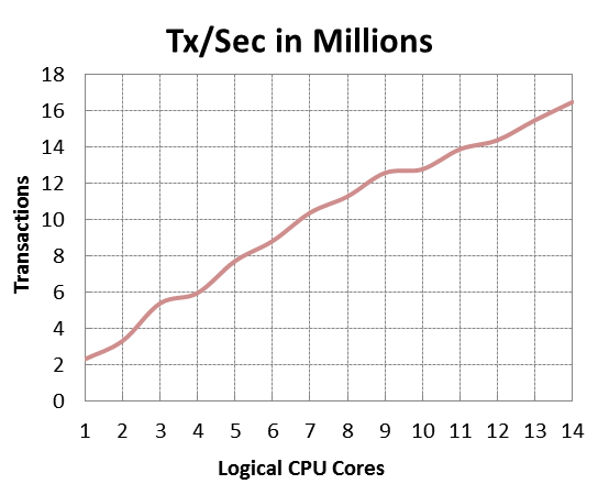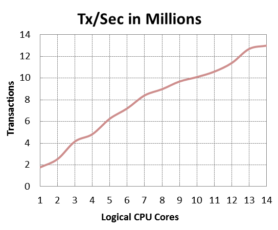 In this benchmark we test the scalability of mixed workload performance on multiple cores (1, 2, 3 .. 14) with the following read/write ratios - 1 delete per 4 updates, per 8 inserts, per 64 selects.