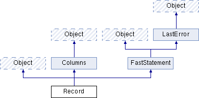 Record is statement class that provides active record pattern services. It is used to insert, select, update, delete and iterate rows in a database table. More...